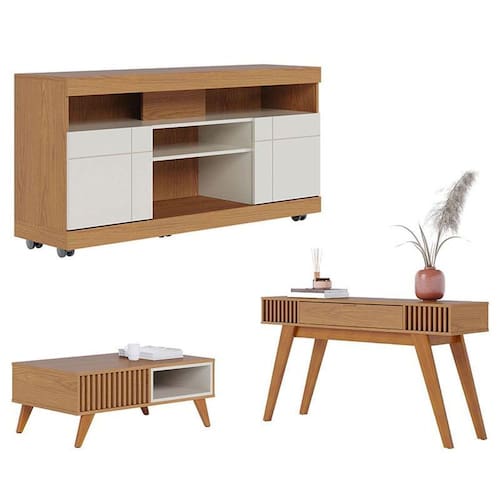 Rack Bancada Yara com Mesa de Centro Jeri Freijó Off White e Aparador Riviera Freijó Colibri