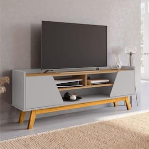 O Rack Turim possui design marcante que mescla linhas diagonais em suas portas chanfradas em ângulo com dobradiças como sistema softclose e pés de madeira maciça, proporcionando design retrô e distinto! Possui uma prateleira e três nicho que são ideia para acomodar os mais variados tipos de aparelho eletrônicos que complemente sua TV, bem como vários tipos de objetos de decoração.