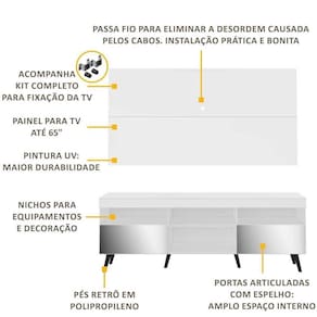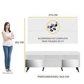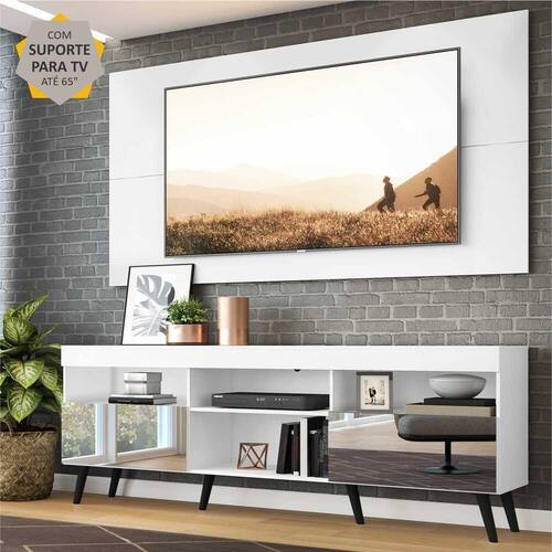 A sala de estar é o melhor lugar para receber a família e amigos, por isso ter um ambiente bonito e aconchegante é fundamental. O Rack com Painel e Suporte para TV 65" com Espelho e Pés Retrô Flórida Multimóveis é uma ótima opção para aproveitar seu espaço de maneira inteligente. Produzido em MDP com pintura UV, que garante maior durabilidade e facilidade na limpeza, possui espaço para os equipamentos eletrônicos e nichos para objetos decorativos, além de duas portas articuladas com espelho e um amplo espaço interno para manter seus pertences organizados. O painel para TV de até 65 possui espaçamento para passagem dos fios, que permite deixar os cabos mais organizados. Devido as variações de tamanho dos televisores no mercado, sugerimos que verifique as medidas da sua TV e compare com o painel antes de efetuar a compra.Para facilitar a sua vida, este produto acompanha também o kit para fixação da TV. Muito prático e de fácil instalação, pode ser utilizado para TVs LCD, LED e plasma de 14 a 71. Totalmente sobreposto, acompanha gabarito de montagem que auxilia na instalação. Conta com um sistema de encaixe rápido, possui 16mm de deslocamento que permite o ajuste do encaixe das peças. Os espelhos são de vidro (o que evita que a imagem fique distorcida) e lapidados, ou seja, passam por um processo para que as bordas não fiquem cortantes, o que garante maior segurança.Os pés palito, estilo retrô, em polipropileno, dão um charme especial ao móvel deixando-o com um visual leve e permitindo você compor um ambiente com ar vintage e moderno ao mesmo tempo.No mercado moveleiro desde 1995, a Multimóveis utiliza tecnologia de ponta e se diferencia através do acabamento superior, demonstrando o cuidado e carinho na fabricação dos móveis. Utilizamos matéria-prima de madeira proveniente de reflorestamento, que contribui para a preservação do meio ambiente.Tamanho Painel TV: 175 x 90cmDevido as variações de tamanho dos televisores no mercado, sugerimos que verifique as medidas da sua TV e compare com o painel antes de efetuar a compra.Dimensões do produto montado:Painel - Altura: 90cm | Largura: 175cm | Profundidade: 2,5cmRack - Altura: 63,6cm | Largura: 175cm | Profundidade: 34,6cmDisponível em 9 opções de cores: Branco Branco/Preto Branco/Natural Preto Preto/Branco Preto/Natural Duna/Branco Duna/Preto Duna/Natural.As cores do produto podem sofrer variações de tonalidade de acordo com as configurações do seu monitor/celular.Imagem meramente ilustrativa. Decoração não acompanha o produto.Produto NOVO acompanha nota fiscal, manual de montagem e certificado de garantia.O produto será entregue desmontado e a Multimóveis não disponibiliza o serviço de montagem.