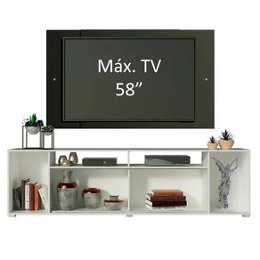 O painel tem design que mistura padrões verticais e horizontais. Comporta de até 58 polegadas e possui uma abertura central que facilita na passagem dos fios. Por ser separado do rack, pode ser fixado na altura desejada, conforme sua preferência ou necessidade.