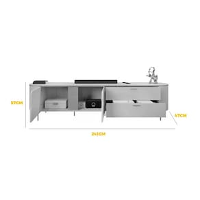 Rack Celine com Painel Celine para TV até 75 Polegadas com LED 2 Portas 2 Gavetas DJ O Rack Celine com Painel Celine para TV até 75 Polegadas com LED 2 Portas 2 Gavetas DJ é ideal para quem deseja uma sala moderna e elegante, dando o destaque que ela merece. As luzes de LED embutidas no painel trazem um toque de elegância e sofisticação ao ambiente, criando uma atmosfera acolhedora para suas noites de filme em casa. Com 2 portas e 2 gavetas, este rack proporciona amplo espaço para armazenar seus dispositivos eletrônicos, filmes, controles remotos e muito mais. Chega de bagunça na sala de estar! Organize-se e aproveite o melhor do entretenimento em família com o Rack Celine com Painel Celine. Produzido com materiais de alta qualidade e acabamento impecável, este móvel é resistente e durável, garantindo que você desfrute de sua funcionalidade e beleza por muitos anos. E o melhor de tudo: o design moderno e minimalista combina perfeitamente com qualquer estilo de decoração, desde o clássico até o contemporâneo.\nMEDIDAS\nAltura (Rack) 57 cm\nLargura (Rack) 241 cm\nProfundidade (Rack) 47 cm\nAltura (Painel) 132 cm\nLargura (Painel) 241 cm\nProfundidade (Painel) 5 cm\nCARACTERÍSTICAS\nFabricante DJ\nModelo Rack Celine com Painel Celine\nGarantia 3 meses\nTipo de Produto Rack com Painel para TV\nAmbiente Sala de Estar\nEstrutura MDF\nEstilo Moderno\nQuantidade de Gavetas 02\nIdeal para TVs de até 75 Polegadas\nQuantidade de Portas 02\nTipo de Corrediça Telescópica\nTipo de Porta Bater\nPossui Iluminação LED Sim\nNecessita Montagem Sim\nAcompanha Manual de Instalação Sim\nINFORMAÇÕES IMPORTANTES\nObjetos decorativos que porventura apareçam na foto, não acompanham o produto. Não nos responsabilizamos pela montagem/instalação dos produtos.\nMontagens, desmontagens e instalações são responsabilidades do cliente. Indicamos que contrate uma empresa de montagem ou um montador de sua confiança.\nAlém disso, favor verificar se os pés e acessórios estão dentro do forro inferior do produto. Em suma, todas as informações divulgadas sobre o produto são de responsabilidade do Fabricante.\nAs cores do produto podem variar de acordo com o seu monitor, a iluminação do ambiente em que você está e até mesmo a sua percepção visual. Além da cor, pequenos detalhes e acabamentos podem não ficar evidentes na foto, por isso as imagens são meramente ilustrativas.