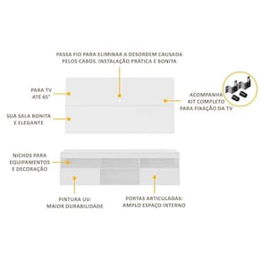 Produzido em MDP com pintura UV, que garante maior durabilidade e facilidade na limpeza, possui espaço para os equipamentos eletrônicos e nichos para objetos decorativos, além de duas portas articuladas com um amplo espaço interno para manter seus pertences organizados. O painel P/TV de até 65 possui espaçamento para passagem dos fios, que permite deixar os cabos mais organizados. Devido as variações de tamanho dos televisores no mercado, sugerimos que verifique as medidas da sua TV e compare com o painel antes de efetuar a compra.