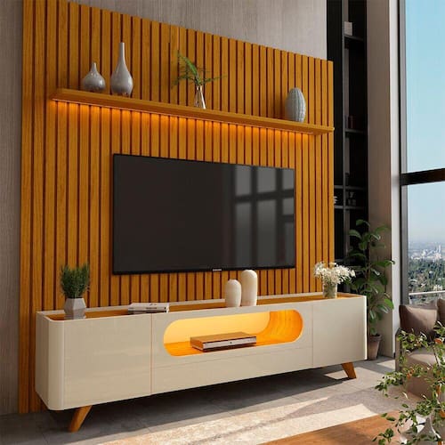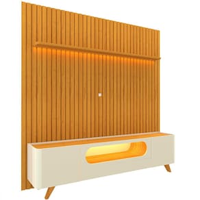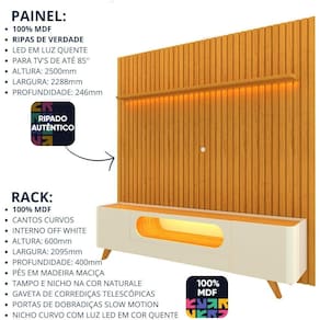 O conjunto Rack e Painel é a peça ideal para quem deseja modernidade e sofisticação em sua sala de estar. O painel conta uma linda prateleira chanfrada com bordas laqueadas, o complemento possibilita duas opções de montagem, sendo elas na parte superior e inferior do produto, com LED em luz quente com difusor e ripas autênticas. Já o Rack possui formas curvas e orgânicas que destacam seu design moderno e elegante. Com luz LED em cor quente que traz um tom de aconchego e conforto ao ambiente.
