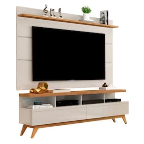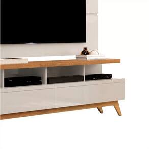 CARACTERÍSTICAS DO PRODUTO - Fabricado em MDP /MDF - Pintura UV com acabamento amadeirado Touch (cores amadeiradas) / brilho (cor off white) - Painel com prateleira superior em MDP - 2 Gavetas com corrediças telescópicas para organizar objetos pessoais - Nichos para acomodar seus aparelhos eletrônicos - Detalhe nas gavetas do rack - Pés em madeira natural - Fixação do painel na parede através de réguas - Ideal para TV de até 65”