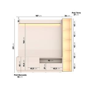A iluminação embutida valoriza o painel e cria uma atmosfera acolhedora, destacando a TV e os objetos decorativos. O conjunto conta com cristaleira lateral com portas em vidro reflecta, que proporcionam um efeito elegante e contemporâneo. As molduras em alumínio garantem resistência e acabamento refinado, enquanto as dobradiças com amortecedor asseguram um fechamento suave, silencioso e confortável.