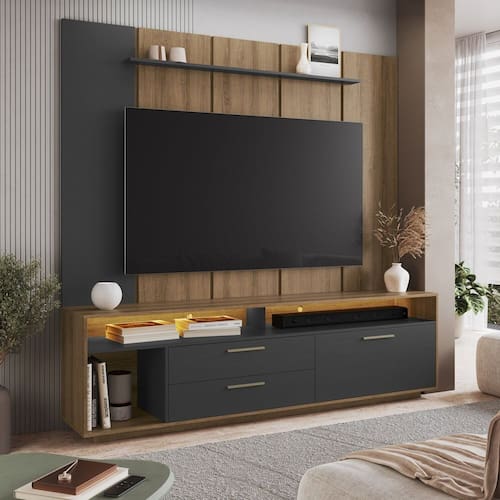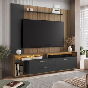Otimizar espaços é uma das metas da Art In Móveis, por isso criamos o Home para TV com iluminação led Reims. Este produto foi produzido em excelente material MDP com acabamento Finish Foil, que garante maior resistência e qualidade em seu móvel, suportando Tv até 75 polegadas e o charme dos negativos refinam o visual do painel. A essência de criar soluções que trazem mais conforto sua vida é o grande diferencial dos produtos Art In Móveis. Cada nova ideia é uma mistura de criatividade, funcionalidade e muita dedicação. Produto Montado: Sim Acabamento: Finish Foil Acabamento da Gaveta: Finish Foil Acabamento da Porta: Finish Foil Acabamento da Prateleira: Finish Foil Acompanha Lâmpada: 01 Altura do Conjunto: 191,8 cm Altura do Painel: 136 cm Altura do Rack: 58,4 cm Ambiente Principal: Sala de Estar codigo_ean: 7900288247308 Complexidade da Montagem: Média: pode ser montado por mais de uma pessoa e/ou necessite de maior conhecimento para montagem Cor: Grafite/Mel Cor do Produto: Grafite/Mel Cor Flex: Não Cor Interna: Grafite Escala de Brilho: Fosco Escala de Brilho da Gaveta: Fosco Escala de Brilho da Porta: Fosco Escala de Brilho da Prateleira: Fosco Espessura do Painel: 12 cm Espessura do Tampo: 15 mm Fixação na Parede: Sim Gaveta com Chave: Não Ideal para TVs até (Polegadas): 75 Itens Inclusos: 1 Rack, 1 Painel, Kit Ferragens e Manual de Montagem Largura do Conjunto: 200 cm Largura do Painel: 200 cm Largura do Rack: 200 cm Linha ou Coleção: Reims Manual de Montagem e Instalação: https://product-hub-prd.madeiramadeira.com.br/417183788/documents/d7a28f2a-3d3f-4fb4-8303-f5c1cd29f5e9323699152251758813681185.pdf Marca: Art in Móveis Material da Gaveta: MDP Material da Porta: MDP Material da Prateleira: MDP Material do Puxador da Gaveta: PVC Material do Puxador da Porta: PVC Material Principal: MDP Montagem Flex: Não Necessita Montagem: Sim Origem do Produto: Nacional Peso do Painel: 29,7 kg Peso do Rack: 41,2 kg Peso Máximo por Gaveta: 5 kg Peso Máximo por Prateleira: 5 kg Possui Adega: Não Possui Espelho: Não Possui iluminação: Sim Possui Passa Cabos: Sim Possui Pés: Não Possui Tomada: Não Possui Vidro: Não Profundidade do Conjunto: 36,6 cm Profundidade do Painel: 12.0000 Profundidade do Rack: 36,6 cm Quantidade de Gavetas: 02 Gavetas Quantidade de Nichos: 03 Recomendações de Uso, Manutenção e Limpeza: Para a limpeza do móvel utilizar pano levemente umedecido Sistema de Montagem: Parafusos, cavilhas e minifix Suporte de TV Universal Incluso: Não Tipo de Corrediça da Gaveta: Metálica Telescópica Tipo de Dobradiça/Corrediça da Porta: Metálica Tipo de Puxador da Gaveta: Externo Tipo de Puxador da Porta: Externo