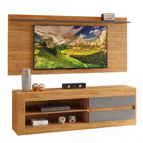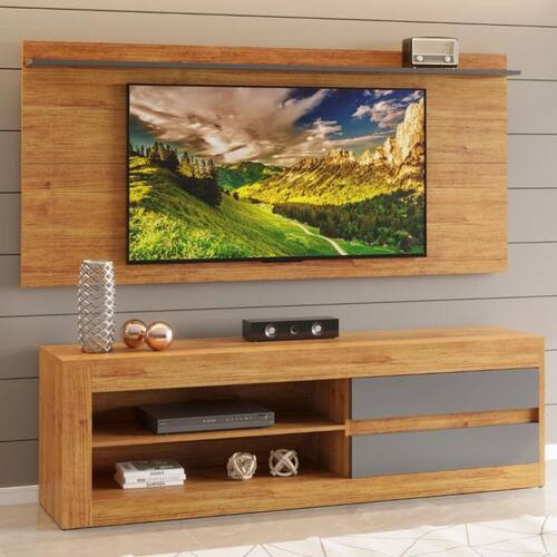 Estrutura em MDP/MDF 1 Prateleira superior no painel 1 Prateleira no rack 2 gavetas Possui saída para fios Painel com fixação na parede Painel comporta TVs de até 55 polegadas Rack comporta TVs de até 75 polegadas Acabamento em pintura UU, semi-brilho Não acompanha suporte para TVs