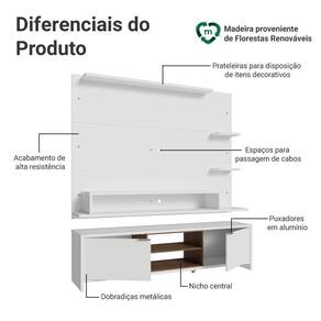 O conjunto se destaca pelo acabamento branco no painel e no rack, que traz leveza ao ambiente, enquanto o nicho no tom amadeirado Rustic cria um contraste elegante e acolhedor.