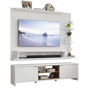 O conjunto se destaca pelo acabamento branco no painel e no rack, que traz leveza ao ambiente, enquanto o nicho no tom amadeirado Rustic cria um contraste elegante e acolhedor.