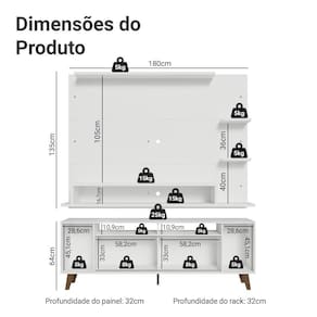 O Painel para TV comporta TVs de até 60 polegadas e conta com espaço para passagem de fios e cabos, ajudando a manter tudo organizado. O Rack possui nichos de tamanhos variados, com espaços que facilitam a organização. Os pés elevam o móvel, melhoram a sustentação e completam o visual com um toque moderno.