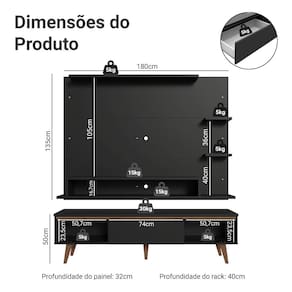 O Painel para TV comporta TVs de até 60 polegadas. Possui espaço para passagem de fios e cabos, ajudando a manter tudo organizado. O Rack oferece excelente espaço interno. Possui duas portas laterais e uma gaveta central com corrediças metálicas, perfeitas para guardar objetos de forma prática.