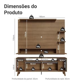 O Painel para TV comporta TVs de até 60 polegadas e conta com espaço para passagem de fios e cabos, ajudando a manter tudo organizado. O Rack possui nichos de tamanhos variados, com espaços que facilitam a organização. Os pés elevam o móvel, melhoram a sustentação e completam o visual com um toque moderno.