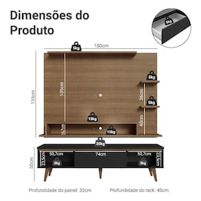 O destaque fica por conta dos pés em madeira maciça no tom marrom, que garantem melhor sustentação. O acabamento do rack é em preto com detalhes que combinam com o painel no tom amadeirado rustic.