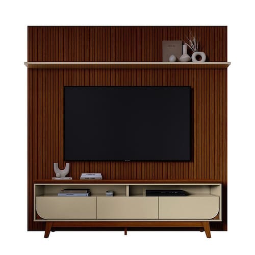 Painel em MDF frisado (baixo relevo), três gavetas com corrediças telescópicas, gavetas laterais com detalhe curvo, tampo da bancada suspenso em 25mm com borda chanfrada, pés usinados, estrutura com chapas em MDP e MDF de 12, 15 e 25mm. Produto Montado: Sim Acabamento: Pintura UV Acabamento da Gaveta: Pintura UV Acabamento da Prateleira: Pintura UV Acabamento dos Pés: Pintura Altura do Painel: 244,5 cm Altura do Rack: 62,5 cm Altura dos Pés: 7,5 cm Altura Máxima dos Pés: 7.5000 Ambiente Principal: Sala de Estar codigo_ean: 7900288101006 Complexidade da Montagem: Média: pode ser montado por mais de uma pessoa e/ou necessite de maior conhecimento para montagem Cor: Cinamomo/Off White Cor do Produto: Cinamomo/Off White Escala de Brilho: Semi-Brilho Escala de Brilho da Gaveta: Semi-Brilho Escala de Brilho da Prateleira: Semi-Brilho Espessura do Painel: 18,5 cm Espessura do Tampo: 25 mm Gaveta com Chave: Não Ideal para TVs até (Polegadas): 75 Itens Inclusos: 1 Rack, 1 Painel, 1 Manual de Montagem Largura do Painel: 238 cm Largura do Rack: 200 cm Manual de Especificação Técnica: https://product-hub-prd.madeiramadeira.com.br/982051/documents/864c2a1c-fbf3-42eb-a35b-527a807db109275495082617424811018078.pdf Manual de Montagem e Instalação: https://product-hub-prd.madeiramadeira.com.br/982051/documents/53280ce2-75d5-49f2-946d-3dd2db41a9dc275494982617424810999662.pdf Marca: Madetec Material da Gaveta: MDF/MDP Material da Prateleira: MDP Material dos Pés: MDP Material Principal: MDF/MDP Necessita Montagem: Sim Peso do Painel: 73 kg Peso do Rack: 54,4 kg Peso Máximo por Gaveta: 5 kg Peso Máximo por Prateleira: 5 kg Possui Espelho: Não Possui iluminação: Não Possui Passa Cabos: Sim Possui Pés: 05 Possui Portas: Não Possui Tomada: Não Possui Vidro: Não Profundidade do Painel: 18.5000 Profundidade do Rack: 36 cm Quantidade de Gavetas: 03 Gavetas Quantidade de Nichos: Não Recomendações de Uso, Manutenção e Limpeza: "Para a limpeza utilizar um pano limpo e seco. Não limpar com produtos abrasivos ou escovas;Não deixar exposta à luz do sol diretamente pois isso irá diminuir a vida útil do produto;Este produto Não é recomendado Para ambientes externos onde possa receber chuva." Sapatas Niveladoras: Não Sistema de Montagem: Girofix Suporte de TV Universal Incluso: Não Tipo de Corrediça da Gaveta: Metálica Telescópica Tipo de Puxador da Gaveta: Embutido