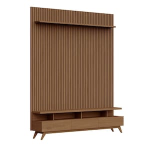 O Rack com painel Yucca combina elegância e versatilidade em um só produto. Com o painel ripado em relevo de 15mm e estrutura em MDF 15mm, oferece resistencia e sofisticado. Já o rack possui estrutura em MDF, tampo de 40 mm, pés em madeira maciça e acabamento em pintura UV. Suporta TVs de até 72", possui gavetas com corrediças telescópicas. O móvel ideal para transformar sua sala com design contemporâneo e funcionalidade. Produto Montado: Sim Acabamento: Pintura UV Acabamento da Gaveta: Pintura UV Acabamento da Prateleira: Pintura UV Acabamento dos Pés: Verniz Acompanha Manual de Instalação: Sim Altura do Painel: 250 cm Altura do Rack: 62 cm Altura dos Pés: 20 cm Altura Máxima dos Pés: 20.0000 Ambiente Principal: Sala de Estar codigo_ean: 7900288265548 Complexidade da Montagem: Média: pode ser montado por mais de uma pessoa e/ou necessite de maior conhecimento para montagem Cor: Cedro Cor do Produto: Cedro Escala de Brilho: Semi-Brilho Escala de Brilho da Gaveta: Semi-Brilho Escala de Brilho da Prateleira: Semi-Brilho Espessura do Painel: 20,5 cm Espessura do Tampo: 42 mm Fixação na Parede: Sim Gaveta com Chave: Não Ideal para TVs até (Polegadas): 72 Itens Inclusos: 1 Rack, 1 Painel, Manual de Montagem e Kit Ferragens Largura do Painel: 185,5 cm Largura do Rack: 180 cm Manual de Montagem e Instalação: https://product-hub-prd.madeiramadeira.com.br/101978355/documents/13a98833-c8ef-4af1-aff2-40af1afbcc403278417600517607236745064.pdf Marca: CabeCasa MadeiraMadeira Material da Gaveta: MDF Material da Prateleira: MDF Material dos Pés: Eucalipto Material Principal: MDF Necessita Montagem: Sim Origem do Produto: Nacional Peso do Painel: 75,03 kg Peso do Rack: 48,26 kg Peso Máximo por Gaveta: 5 kg Peso Máximo por Prateleira: 5 kg Possui Adega: Não Possui Espelho: Não Possui iluminação: Não Possui Passa Cabos: Sim Possui Pés: 05 Possui Portas: Não Possui Prateleiras: Sim Possui Tomada: Não Possui Vidro: Não Profundidade do Painel: 20.5000 Profundidade do Rack: 40 cm Quantidade de Gavetas: 03 Gavetas Quantidade de Nichos: 01 Recomendações de Uso, Manutenção e Limpeza: A limpeza deve ser feita com pano macio, levemente umedecido com água e sabão neutro. Em seguida, passe um pano seco para evitar o acúmulo de umidade. Nunca utilize produtos abrasivos, esponjas de aço, alvejantes, álcool em excesso ou solventes, pois esses produtos podem agredir o acabamento e comprometer sua aparência. Sapatas Niveladoras: Não Sistema de Montagem: Parafusos, cavilhas e minifix Suporte de TV Universal Incluso: Não Tipo de Corrediça da Gaveta: Metálica Telescópica Tipo de Puxador da Gaveta: Embutido