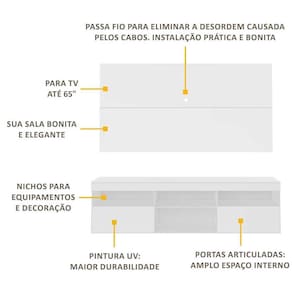 Produzido em MDP com pintura UV, que garante maior durabilidade e facilidade na limpeza, possui espaço para os equipamentos eletrônicos e nichos para objetos decorativos, além de duas portas articuladas com um amplo espaço interno para manter seus pertences organizados. O painel P/TV de até 65 possui espaçamento para passagem dos fios, que permite deixar os cabos mais organizados. Devido as variações de tamanho dos televisores no mercado, sugerimos que verifique as medidas da sua TV e compare com o painel antes de efetuar a compra.