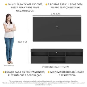 Produzido em MDP com pintura UV, que garante maior durabilidade e facilidade na limpeza, possui espaço para os equipamentos eletrônicos e nichos para objetos decorativos, além de duas portas articuladas com um amplo espaço interno para manter seus pertences organizados. O painel para TV até 65 possui espaçamento para passagem dos fios, que permite deixar os cabos mais organizados. Devido as variações de tamanho dos televisores no mercado, sugerimos que verifique as medidas da sua TV e compare com o painel antes de efetuar a compra.