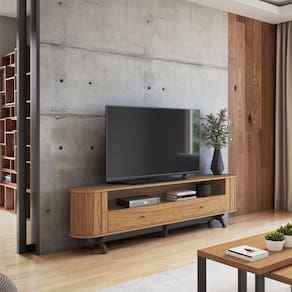 Características: Estrutura 100% MDF Acabamento em Pintura UV Design Curvo Exclusivo 02 Gavetas com Corrediças Telescópicas Pés em MDF Laterais com Ripado Curvo Puxadores Metálicos Ideal para TV até 60 Polegadas