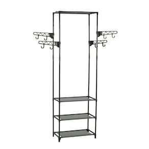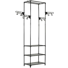 Possui uma estrutura tubular de aço com revestimento em pó, que é leve e resistente, tornando o cabideiro fácil de movimentar e bastante durável. Possui três prateleiras generosas feitas de tecido não tecido e projetadas para manter suas bolsas, sapatos ou pequenos itens organizados e ao alcance. Ele também tem quatro braços laterais com ganchos para espaço de armazenamento adicional para suas roupas mais longas, como casacos e