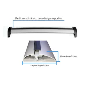 Ficha Técnica: Fabricante: CristalCar Material: Barras aerodinâmicas em alumínio Medidas do perfil barras : 9cm largura x 3cm de altura Capacidade de carga: 40kg distribuídos prevalecer a capacidade de carga do teto do veiculo, veja no manual Instalação: No friso de teto abaixo da borracha do friso do teto do veículo