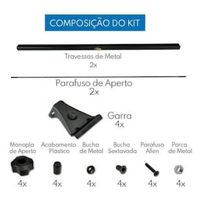 ESPECIFICAÇÃO TÉCNICA: Projetado e desenvolvido para suportar até 45 kg de peso máximo, desde que distribuído de forma uniforme e equilibrada; Manual de instruções, para orientar a montagem, sua capacidade de transporte, regras de utilização e outros informes; Não amassa e nem risca o veículo; Cor preto; Fabricado em Aço; Não exige furações; Fixação na canaleta do teto; Fácil instalação; Ótimo acabamento; Excelente resistência.