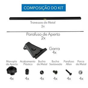 Rack de Teto Spin Sem as Longarinas 12 A 2016 e 2 elasticos A VHIP desenvolveu esse rack sob rigoroso controle de qualidade, cujo processo industrial, segue os padrÃes de seguranÃa, com acompanhamento e supervisÃo tÃcnica contÃnua, visando proporcionar ao consumidor, uma excelente alternativa no transporte de bagagens ou cargas.  Especificaãão TÃCNICA:  Projetado e desenvolvido para suportar atà 45 kg de peso mÃximo, desde que distribuÃdo de forma uniforme e equilibrada;  Manual de instruÃÃes, para orientar a montagem, sua capacidade de transporte, regras de utilizaÃÃo e outros informes;  NÃo amassa e nem risca o veÃculo;  Cor preto;  Fabricado em AÃo;  NÃo exige furaÃÃes;  FÃcil instalaÃÃo;  Ãtimo acabamento;  Excelente resistÃncia.  FICHA TÃCNICA:  Fabricante: VHIP;  Material: Ferro Tubular / AÃo;  Capacidade de carga do rack: 45kg distribuÃdos  Cor: Preto.  Conteãdo DA EMBALAGEM:  2 Racks dianteiro + traseiro ;  Kit InstalaÃÃo;  Manual.