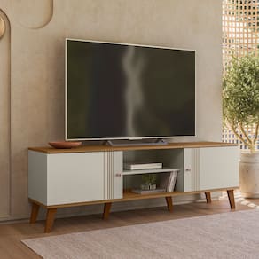 Características: Estrutura em MDP Pintura UV 02 Portas de correr Detalhes frisados Amplo espaço interno Pés de Plástico Ideal para TV até 65 Polegadas.