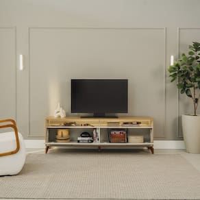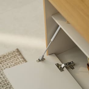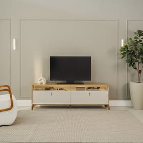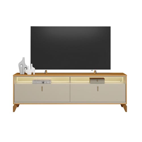 Nicho: 2 Passa Fios: 2 Porta: 2 portas basculantes em MDP com espessura de 15mm Tampo: 15mm material em MDP Pés: 4 pés de madeira em 12cm de altura Dobradiças: 4 dobradiça metálica Luminária: 1 luminária em Led