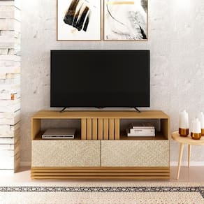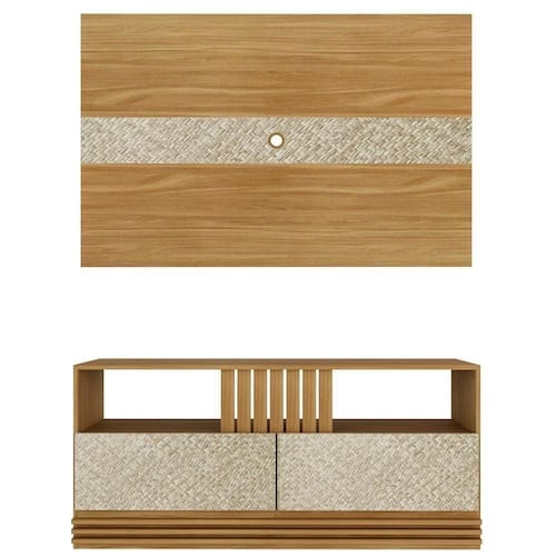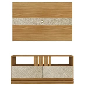 Conjunto De Rack e Painel para TV de até 42 Polegadas - R1479/PA2913. Com estilo para você compor sua sala, deixando sua decoração ainda mais elegante. Possui estrutura em MDP de 15mm, acabamento em pintura Uv (Semi Fosco). Painel com sistema de fixação resistente garantindo a segurança do produto, conta com furação para passagem de cabos e detalhe central em impressão na cor palha texturizada. Rack equipado com 02 gavetas amplas com corrediças metálicas, nichos para itens decorativos ou aparelhos eletrônicos, rodapé com detalhe decorativo ripado, frente das gavetas com acabamento em impressão na cor palha texturizada, proporcionando um visual moderno e elegante ao ambiente, desenvolvido 100% ecologicamente correto, o que garante a resistência e vitalidade do produto, móveis que garantem um visual clean e elegante ao seu ambiente. Estes móveis chegarão na sua casa separados em 02 volumes.