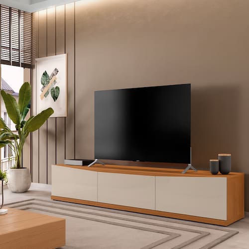 O Rack Eros esbanja beleza e requinte. Elabora com os melhores materiais do mercado, é ideal para sua sala. Possui um designer único, que conta com 2 portas e 1 gaveta com amplo espaço e. A frente de gaveta elaborada em MDP de 15mm usinada e corrediças telescópicas. O Tampo é feito em MDP de 37mm e a base em MDP de 25mm o proporciona ao móvel maior resistência e qualidade. Possui sapatas metálicas com regulagem de altura. Sua pintura conta com acabamento Print Wood, garante ao produto maior qualidade e durabilidade como nenhuma no mercado possui.