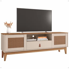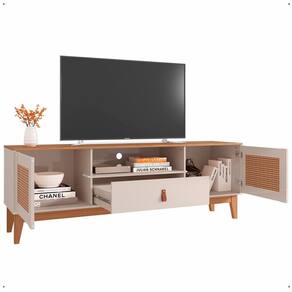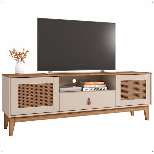O rack possui duas portas molduradas com uma exclusiva pintura 3D de palhinha e sistema push-open (fecho-toque). Além disso, conta com uma gaveta espaçosa, equipada com um puxador de alça de couro ecológico.