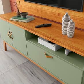 Compatível com TVs de até 55 polegadas, o modelo conta com nichos abertos para aparelhos eletrônicos e objetos decorativos, além de portas que garantem ótimo espaço interno para organização.