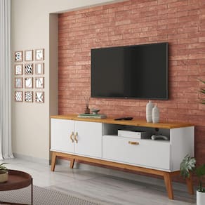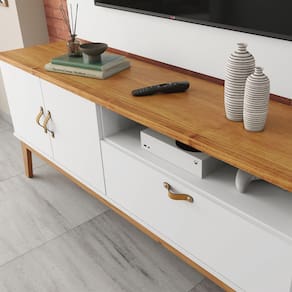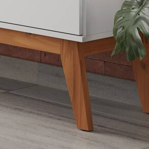 A estrutura com pés em madeira garante firmeza, resistência e um toque natural, tornando o Rack Sirius uma peça versátil e elegante.