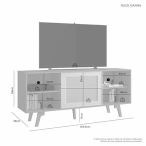 Nada fica fora do lugar quando o Rack Garra faz parte do ambiente! Com compartimentos que organizam todos os eletrônicos que fazem parte da rotina, além de tampo espaçoso para enfeites e, claro, para o aparelho de TV, ele é o aliado ideal para uma sala de estar sempre impecável e de muito bom gosto - dono de um estilo clássico e combinação de cores charmosa, que agrega um toque extra de sofisticação à peça. Produto Montado: Sim Acabamento: Pintura UV Acabamento da Porta: Pintura UV Acabamento da Prateleira: Pintura UV Ambiente Principal: Sala de Estar codigo_ean: 7900288075543 Complexidade da Montagem: Baixa: pode ser montado por uma pessoa sozinha Cor: Cinamomo/Off White Cor do Produto: Cinamomo/Off White Cor Interna: Cinamomo Escala de Brilho: Fosco Escala de Brilho da Porta: Fosco Escala de Brilho da Prateleira: Fosco Ideal para TVs até (Polegadas): 55 Itens Inclusos: 1 Rack + 1 Manual + 1 Kit Ferragem Manual de Montagem e Instalação: https://product-hub-prd.madeiramadeira.com.br/979433/documents/7d3f5a85-0127-479f-9810-50fa40b3bcb6271119264517404275108654.pdf Marca: JCM Móveis Material da Porta: MDF/MDP Material da Prateleira: MDP Material dos Pés: Eucalipto Material Principal: MDF/MDP Necessita Montagem: Sim Origem do Produto: Nacional Peso: 22,85 kg Peso Máximo por Prateleira: 2 kg Possui Adega: Não Possui Espelho: Não Possui iluminação: Não Possui Pés: 05 Recomendações de Uso, Manutenção e Limpeza: PANO LEVEMENTE ÚMIDO Sapatas Niveladoras: Não Sistema de Montagem: PARAUSOS E MINIFIX Tipo de Dobradiça/Corrediça da Porta: Metálica Tipo de Porta: Bater Tipo de Puxador da Porta: Embutido Tipo de Rack: Rack Padrão