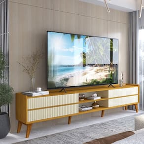 Transforme sua sala em um ambiente elegante e cheio de personalidade com o Rack Magnífico. Produzido 100% em MDF de alta qualidade, o rack possui pés em madeira maciça, bordas chanfradas em 45º, destacando um lindo acabamento refinado. As gavetas com frente ripada vertical oferecem um toque contemporâneo, além de serem equipadas com corrediças telescópicas de abertura "One Touch", tecnologia de abertura através de um sutil toque. Design que une o charme retrô ao estilo moderno, é o móvel perfeito para quem busca praticidade sem abrir mão da beleza.