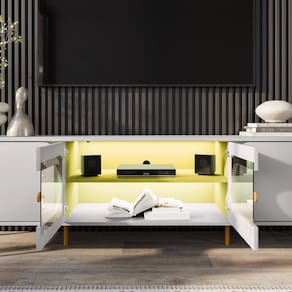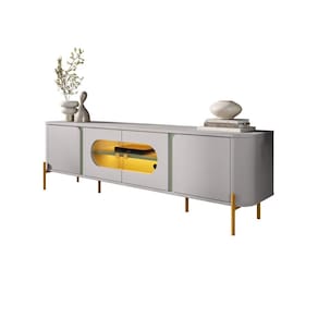 Seu design moderno traz 4 portas em MDF com dobradiças soft close, que garantem fechamento suave e durabilidade. Internamente, conta com 4 nichos bem distribuídos e 1 prateleira, ideais para acomodar eletrônicos, acessórios e objetos decorativos.