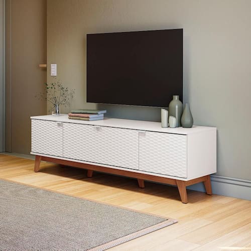 Com amplo espaço, na parte interna o rack possui duas prateleiras e divisórias, permitindo organizar livros e acessórios da sala de estar com praticidade. A base e os pezinhos, na cor canela, além de um design lindo, proporcionam destaque e facilidade na limpeza, garantindo um acabamento completo ao produto.