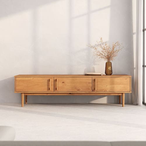 O Rack Madeira Maciça Minimalista Tecca traduz o essencial com personalidade. Feito inteiramente em madeira maciça com acabamento natural Freijó, ele realça os veios e as nuances únicas da madeira, reforçando a beleza do que é simples, bem-feito e duradouro. Seu visual limpo e funcional abriga três portas com puxadores verticais também em madeira, criando um ritmo visual orgânico e discreto.