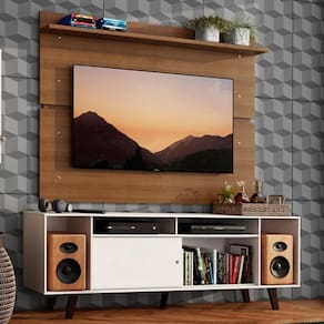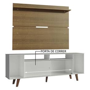 O painel comporta de até 65 polegadas e conta com abertura para passar os fios. Contempla também uma prateleira na parte superior, perfeita para objetos decorativos. Por ser separado do rack, pode ser fixado na altura desejada. O acabamento dos móveis combina os tons branco e amadeirado Rustic. É feito em Poliéster Protetor com 7 camadas, detalhe que confere mais durabilidade e qualidade aos produtos. Além disso, é ecológico, isento de vapores prejudiciais à atmosfera.