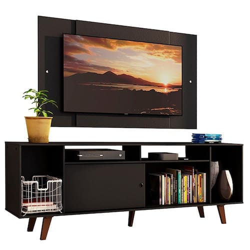 O rack possui um tamanho ótimo, com uma porta de correr que permite fechar o lado esquerdo ou direito da abertura central. Além disso, são vários nichos de tamanhos variados. Assim, cabe tudo de maneira organizada, dos aparelhos eletrônicos até objetos decorativos, livros e revistas. Para completar, os pés dão mais firmeza e aumentam a altura do móvel.