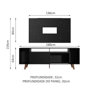 Itens inclusos: - Um (1) Rack de 64 cm de altura x 180 cm de largura x 32 cm de profundidade com pés em PVC - Um (1) Painel de 80 cm de altura x 136 cm de largura