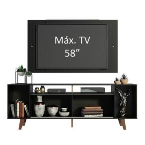 O acabamento combina é todo preto e os pés do rack são em amadeirado Rustic. O processo é feito em Poliéster Protetor com 7 camadas, detalhe que confere mais durabilidade e qualidade aos produtos. Além disso, é ecológico, isento de vapores prejudiciais à atmosfera.