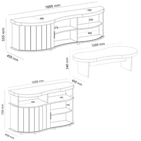 Características adicionais: Rack com tampo em Tamburato de 50mm que suporta TVs até 75 polegadas, 1 porta ripada que desliza em curva e reversível: a cor pode ser escolhida durante a montagem, puxadores em alumínio, pés em plástico; Mesa de Centro com tampo em Tamburato de 50mm, estrutura em MDF de 15mm, pés em plástico; Buffet com tampo em Tamburato de 50mm, 1 porta ripada que desliza em curva e reversível: a cor pode ser escolhida durante a montagem, puxadores em alumínio, pés em plástico.