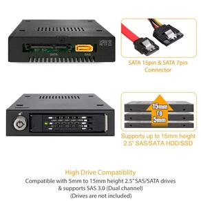 - Serve em 1 x 5 mm a 15 mm SAS/SATA HDD ou SSD de 2,5 polegadas no compartimento externo de 3,5 polegadas.