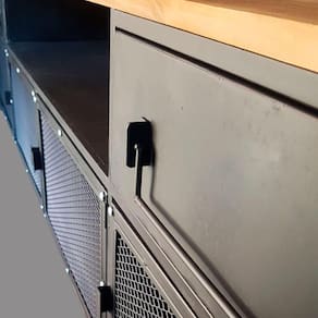 Esse móvel é confeccionado todo em aço carbono, gavetas e tampo em madeira maciça, por uma equipe especializada em móveis em aço e madeira.