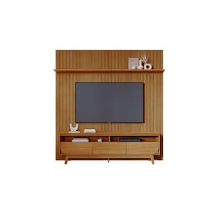 A Composição Luna combina design sofisticado e funcionalidade, sendo fabricada com uma estrutura em MDP e MDF, com chapas de 12, 15 e 25mm, que garantem resistência e durabilidade, e revestida com pintura UV de alta qualidade, que proporciona um acabamento impecável. Suas dimensões são de 2,380 x 2,445 x 0,185m para o painel e 2,000 x 0,625 x 0,360m para a bancada, oferecendo amplo espaço para acomodar TVs de até 75 polegadas. O painel apresenta um elegante frisado em MDF com design em baixo relevo, enquanto a bancada possui um tampo suspenso de 25mm com borda chanfrada, conferindo modernidade ao ambiente. Conta com três gavetas com corrediças telescópicas, sendo duas laterais com detalhes curvos que adicionam sofisticação e uma prateleira para organização adicional, além de pés usinados que garantem estabilidade e estilo. O espaço para TV é de 2,380 x 1,200mm no painel e 2,000 x 0,360m na bancada, suportando um peso total de até 45kg. O sistema de montagem Girofix facilita a instalação, tornando a Composição Luna a escolha ideal para transformar sua sala em um ambiente moderno e acolhedor.