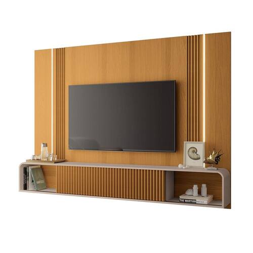 Observações: Desing imponente projetado para TV de até 85” fixada no painel; Iluminação com perfil de LED e apliques canelados nas laterais; Portas de correr com detalhes canelados e trilho em alumínio; Cantos arredondados; Produzido em MDP e MDF com espessura de 15mm;