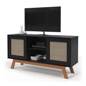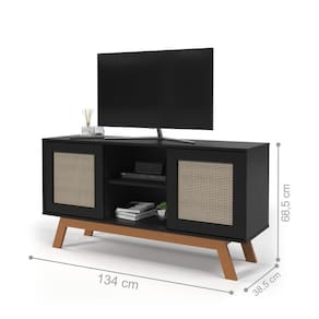 Além de ser produzido em MDF de 15mm, O Rack possui 2 Portas de Correr com Detalhe Rattan Sintético, 1 Prateleira e Pés em Madeira Pinus.