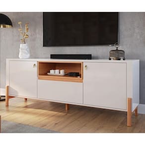 Cor: Off White Perolizado/jequitiba | Altura: 70,5 cm | Largura: 183 cm | Profundidade: 38,4 cm | Quantidade de caixas de embalagem: 02 | Formato do móvel: Rack | Requer montagem: Sim | Cor: Off White Perolizado/Jequitiba