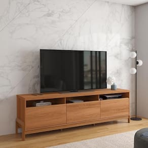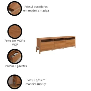 Características TécnicasDimensões:Altura: 63,50 cmLargura: 212,60 cmProfundidade: 38,40 cmPeso: 50 kgMateriais e Estrutura:Tampo em MDP de 37 mm, garantindo durabilidade e resistê gavetas com corrediças telescópicas para um deslizamento porta central equipada com pistão a gás, proporcionando fácil és e puxadores em madeira maciça, oferecendo maior design, estabilidade e ícios e FuncionalidadesEstilo e Modernidade: O design elegante e as cores neutras se adaptam a diversos estilos de decoração.Organização: Amplo espaço para armazenar aparelhos eletrônicos, livros e objetos decorativos.Durabilidade: Materiais de alta qualidade garantem longa vida útil ao produto.Praticidade: Fácil de montar, acompanha manual de instruções detalhado.Compatibilidade: Ideal para TVs de até 70 polegadas.Observações Importantes